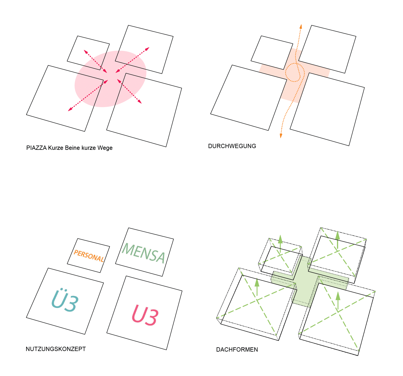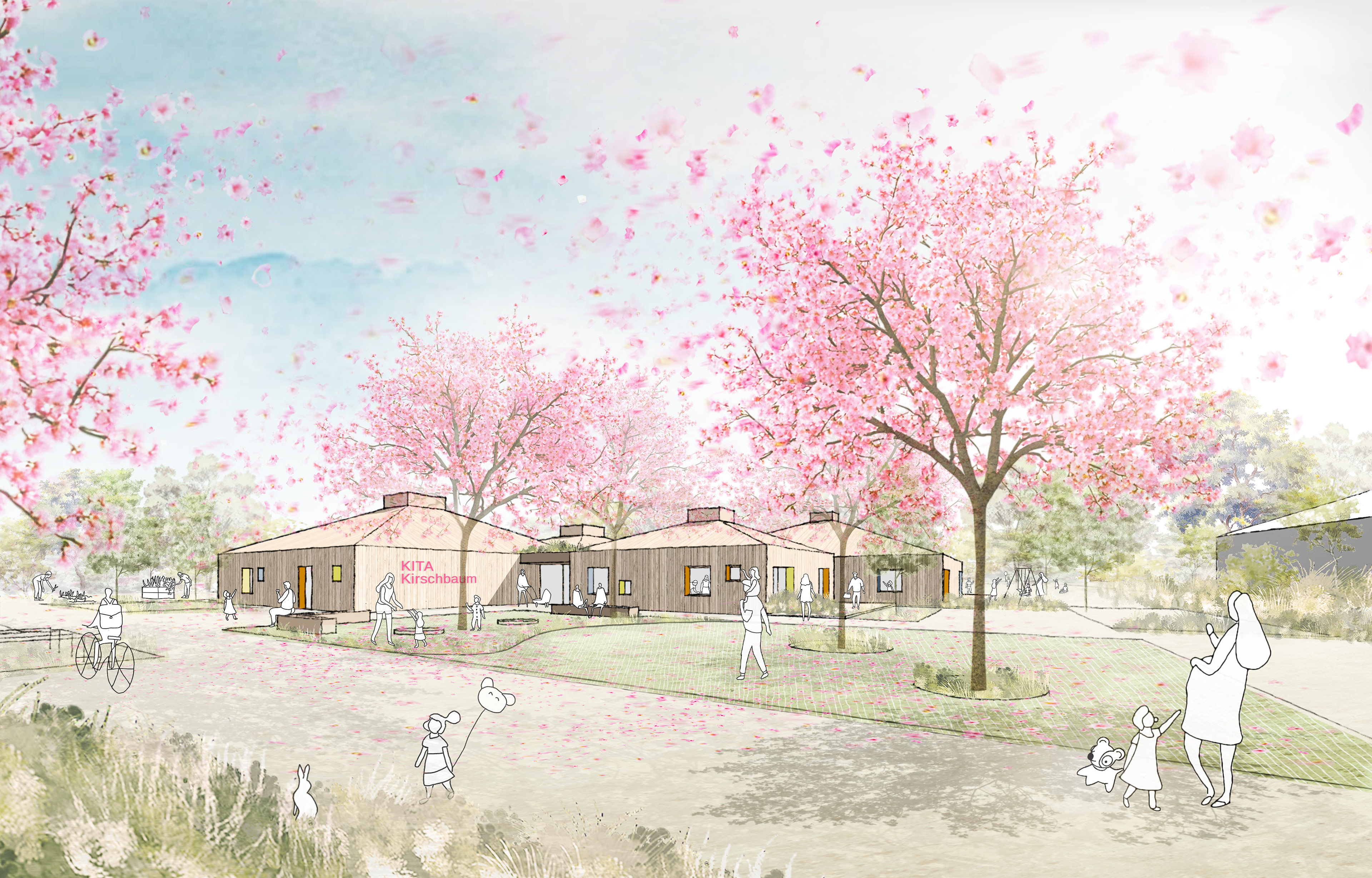 Die KITA im Grünen lädt zum Spielen und Entdecken ein. Die Kirschbäume, um die sich alles dreht, werden zum Gelenk und dienen als natürliche Landmarke. Sie fungieren als identitätsstiftender Anker, um den großzügigen Eingangsbereich der neuen Kita zu markieren - Hier trifft man sich gerne. Vier Häuser wie in einem Dorf, die sich um einen „Platz“ drehen. In dieser Kita gibt es keine Gänge, die gesamte Verkehrsfläche konzentriert sich auf die Mitte.